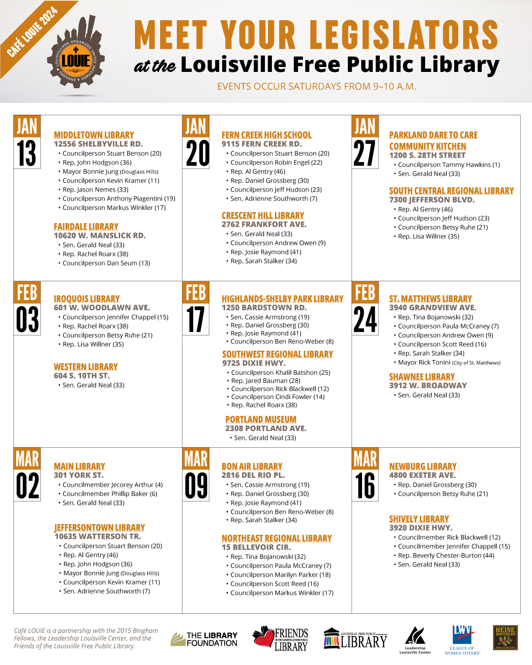 Café LOUIE is a partnership between the Library Foundation, the Louisville Free Public Library (LFPL), the Leadership Louisville Center, and the Friends of the Library. The annual series is designed to facilitate community interaction with state and local legislators.